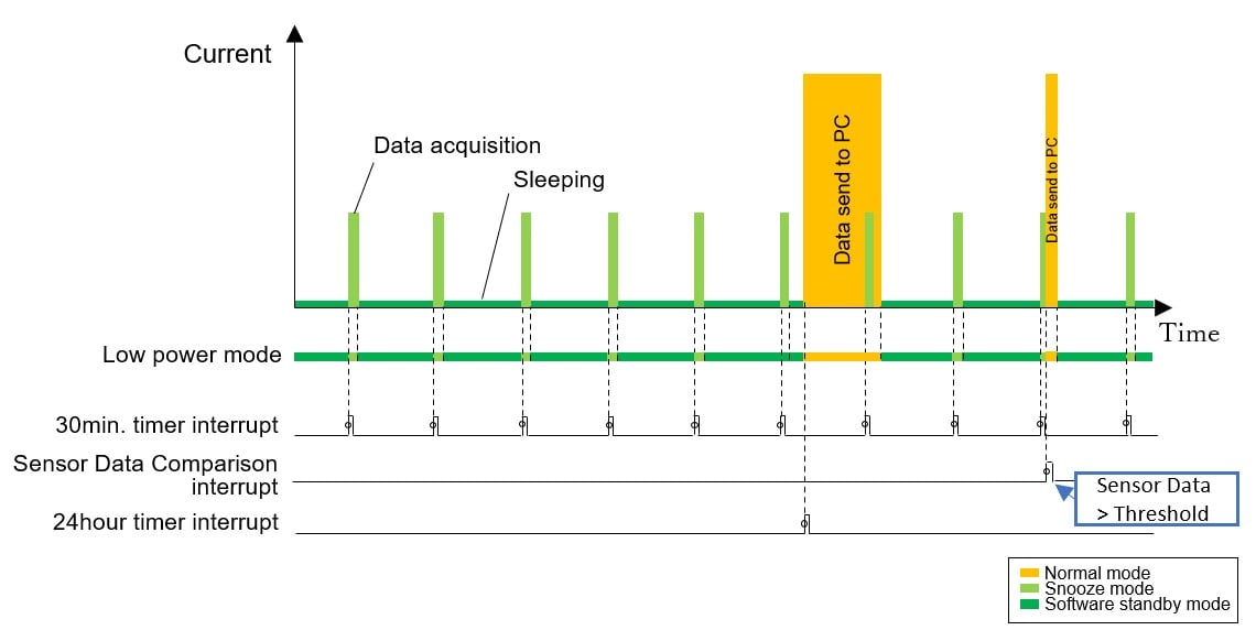 The low-power mode is also canceled by the 24-hour interrupt generated by the real-time clock (RTC), and the sensor data stored in the RAM is output by UART communication.