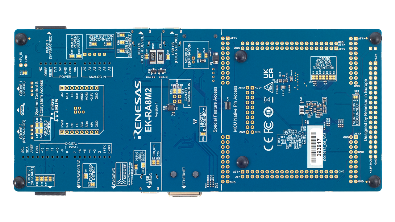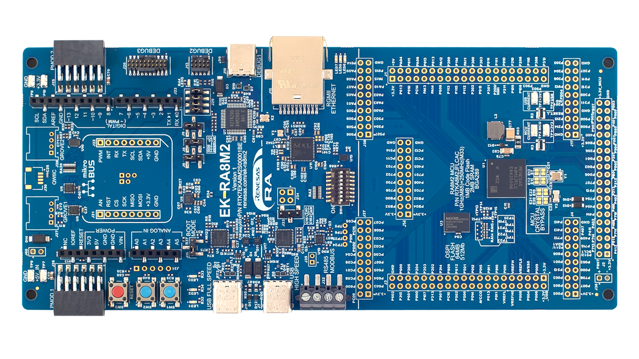 The EK-RA8M2 evaluation kit enables users to evaluate the features of the RA8M2 MCU Group and develop embedded systems applications using Renesas' Flexible Software Package (FSP) and e2 studio IDE. Users can utilize rich onboard features and their choice of popular ecosystem add-ons to realize many industrial, Internet of Things (IoT), and general-purpose applications. In addition, a bundle of example projects is provided to help users to quickly evaluate key peripherals and accelerate proof-of-concept development.