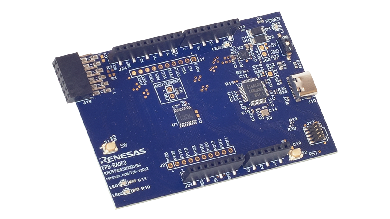 The RA0E3 Fast Prototyping Board features the RA0E3 MCU and provides a streamlined evaluation board for evaluating and developing prototypes across a wide range of applications. It includes a built‑in SEGGER J-Link™ emulator, enabling easy programming and debugging without requiring additional hardware.