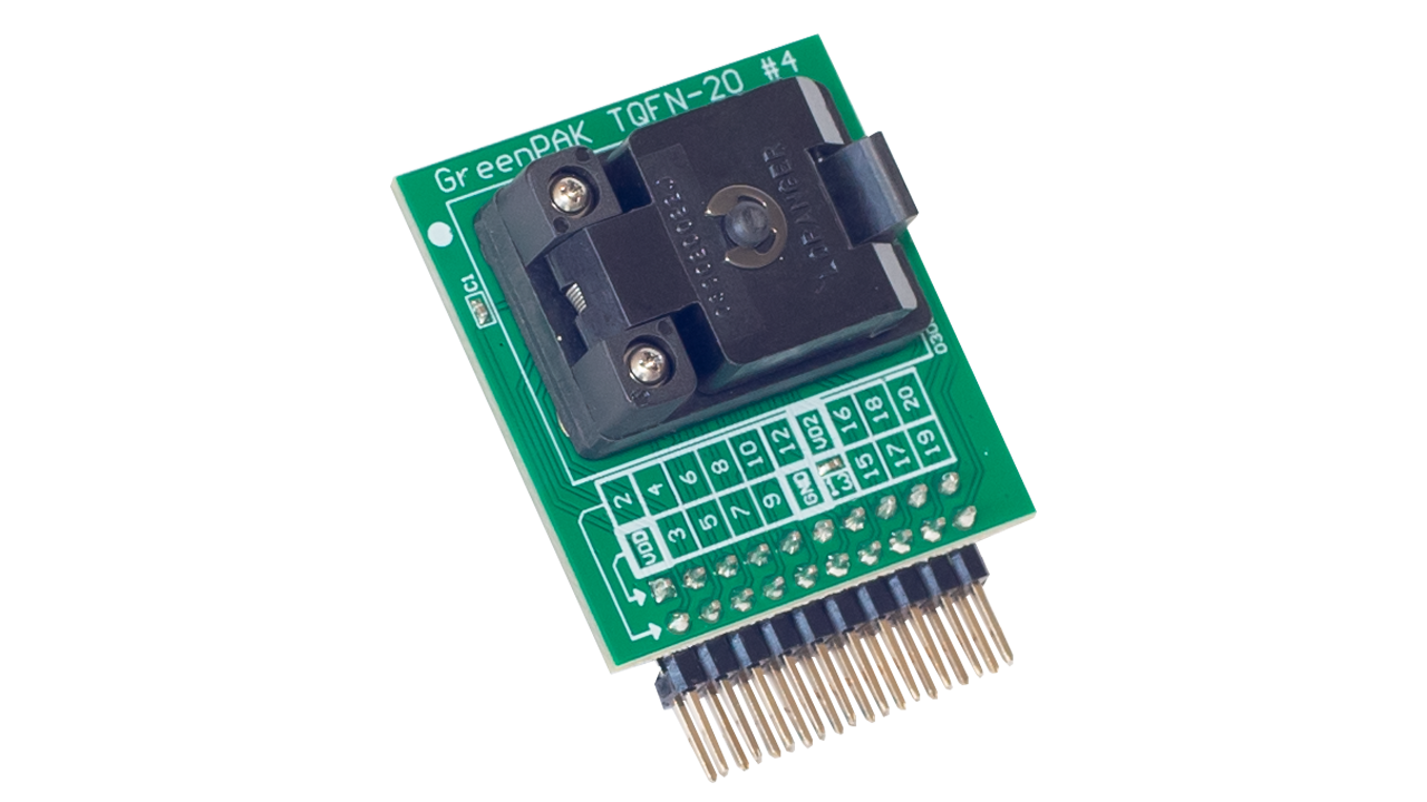 - TQFN-20 socket for the SLG46580 GreenPAK™ programmable mixed-signal matrix