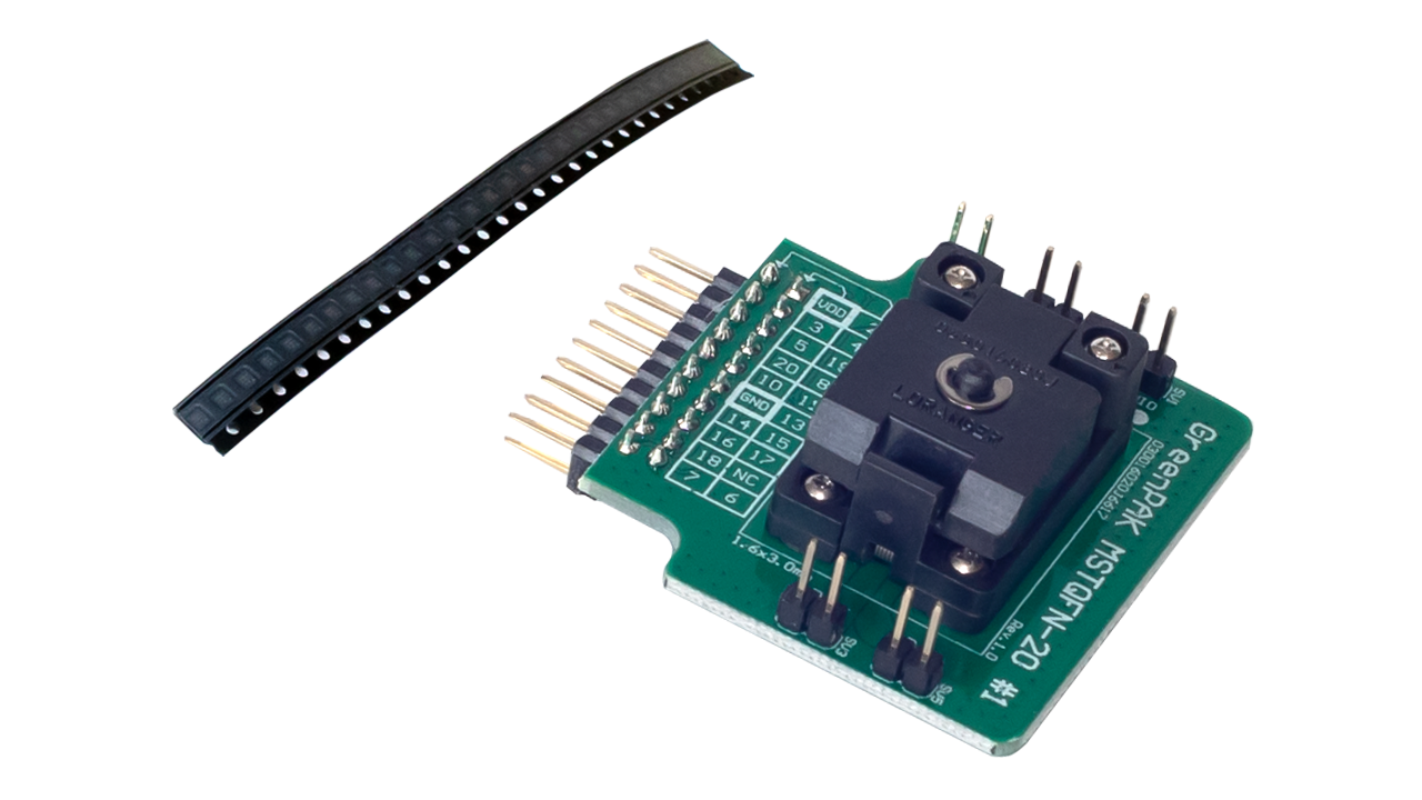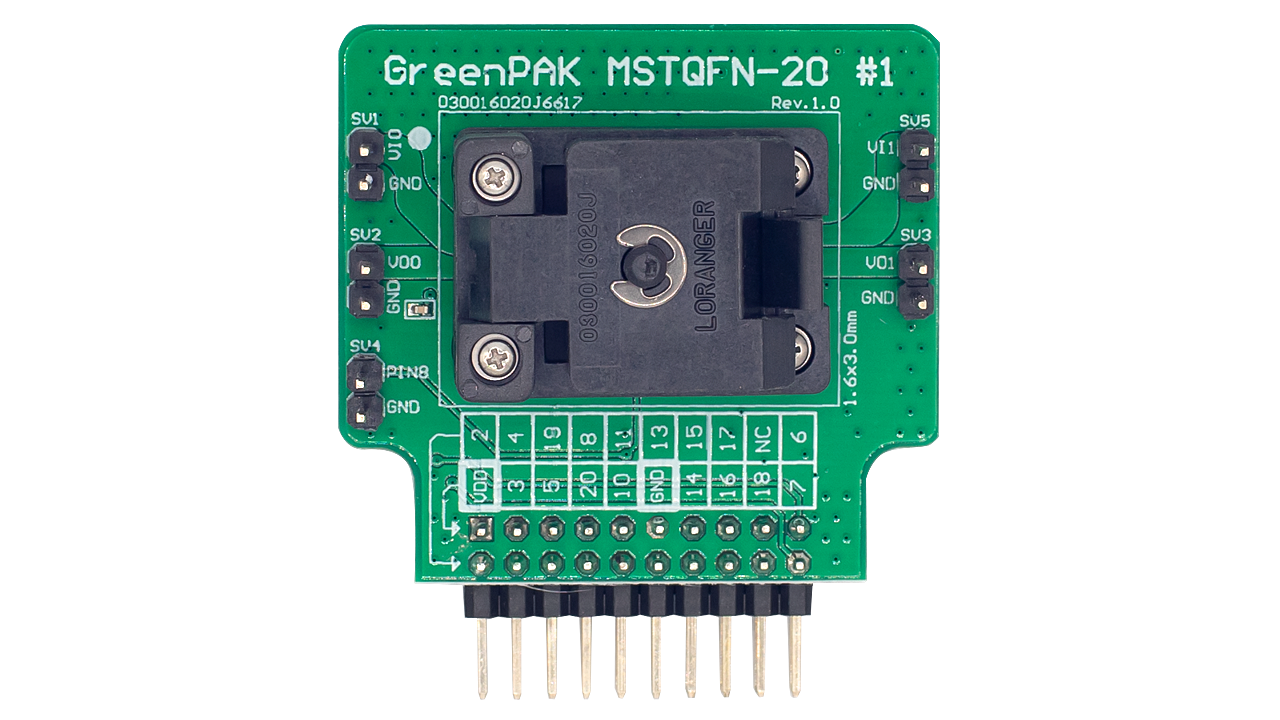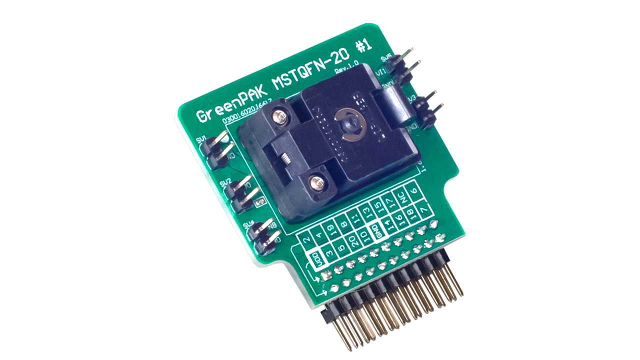 - MSTQFN-20 socket for the SLG46867 GreenPAK™ programmable mixed-signal matrix