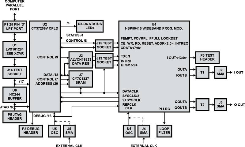 The HSP50415EVAL1 is an evaluation kit for the HSP50415 wideband programmable modulator. The kit consists of an evaluation circuit card Assembly (CCA) complete with the HSP50415 device and additional circuitry to provide for control via a computer parallel port. Windows based demonstration software is provided for full user programmability and control of all HSP50415 operational modes.