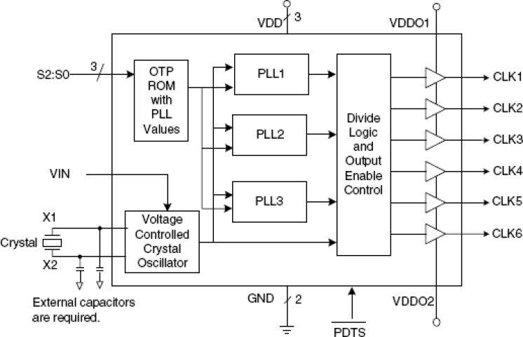 The 271 field programmable VCXO clock synthesizer generates up to six high-quality, high-frequency clock outputs including multiple reference clocks from a low-frequency crystal input. It is designed to replace crystals and crystal oscillators in most electronic systems. Using IDT's VersaClockTM software to configure PLLs and outputs, the 271 contains a One-Time Programmable (OTP) ROM for field programmability. Programming features include VCXO, eight selectable configuration registers and up to two sets of three low-skew outputs. Each of the two output groups are powered by a separate VDDO voltage. VDDO may vary from 1.8 V to VDD. Using Phase-Locked Loop (PLL) techniques, the device runs from a standard fundamental mode, inexpensive crystal, or clock. It can replace VCXOs, multiple crystals and oscillators, saving board space and cost. The 271 is also available in factory programmed custom versions for high-volume applications.