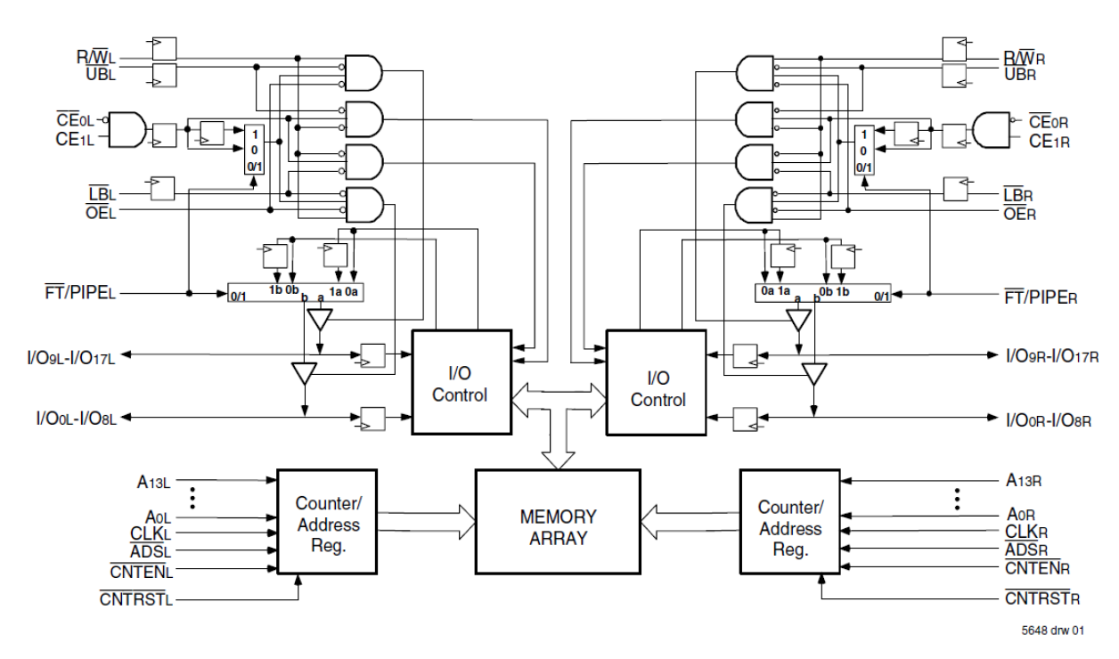 - Flow-through or Pipelined output mode on either port via the FT/PIPE pin