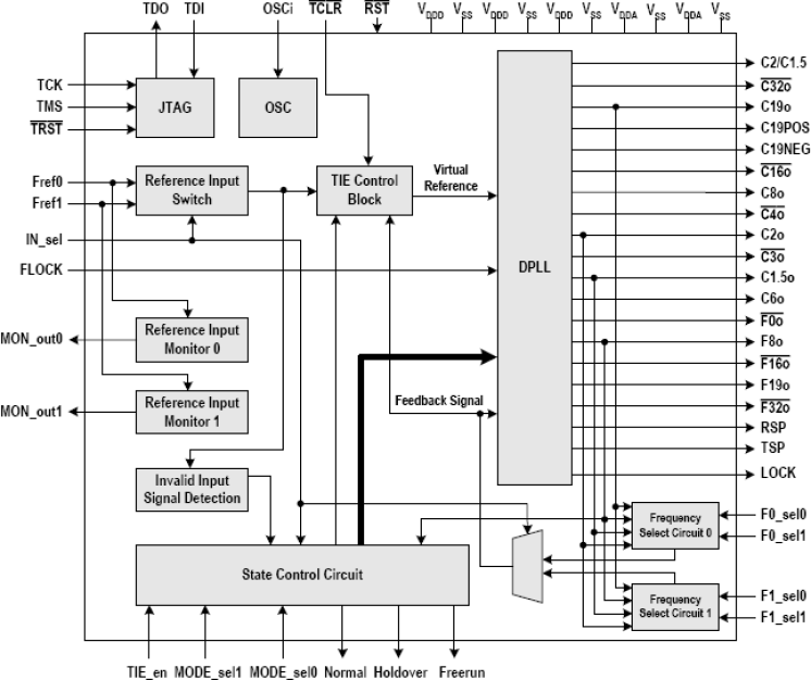 - Provides a C2/C1.5 output clock signal with the frequency controlled by the selected reference input Fref0 or Fref1