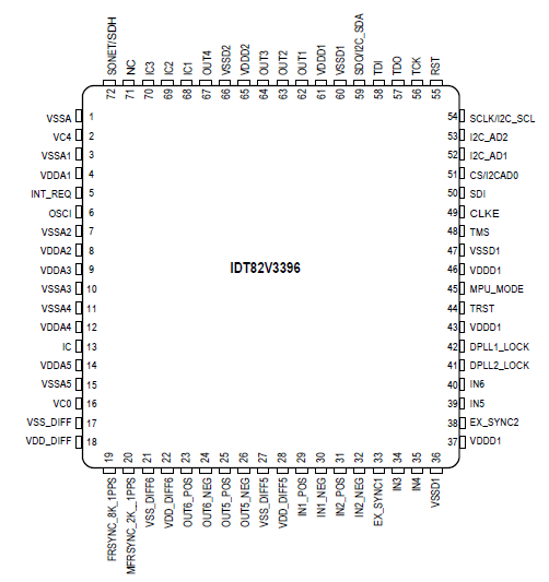 The 82V3396 requires a 12.8MHz master clock for its reference monitors and other digital circuitry. The frequency accuracy of the master clock determines the frequency accuracy of the DPLLs in Free-Run mode. The frequency stability of the master clock determines the frequency stability of the DPLLs in Free-Run mode and Holdover mode.