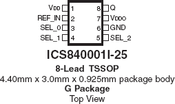 The 840001I-25 is a general-purpose clock generator. The 840001I-25 can accept frequency from a 22.4MHz to 170MHz and generate a 22.4MHz to 170MHz output. The 840001I-25 has excellent phase jitter performance, from 637kHz – 10MHz integration range. The 840001I-25 is packaged in a small 8-pin TSSOP, making it ideal for use in systems with limited board space.