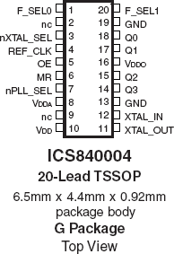 The 840004 is a 4-output LVCMOS/LVTTL synthesizer optimized to generate Ethernet reference clock frequencies. Using a 26.5625MHz, 18pF parallel resonant crystal, the following frequencies can be generated based on the 2 frequency select pins (F_SEL1:0): 212.5MHz, 159.375MHz, 156.25MHz, 106.25MHz, and 53.125MHz. The 840004 uses our third generation low phase noise VCO technology and can achieve 1ps or lower typical random rms phase jitter, easily meeting Ethernet jitter requirements. The 840004 is packaged in a small 20-pin TSSOP package.