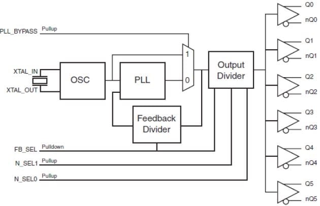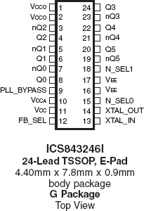 The 843246I is a Crystal-to-3.3V LVPECL Clock Synthesizer/Fanout Buffer designed for Fibre Channel and Gigabit Ethernet applications. The output frequency can be set using the frequency select pins and a 25MHz crystal for Ethernet frequencies, or a 26.5625MHz crystal for a Fibre Channel. The low phase noise characteristics of the 843246I make it an ideal clock for these demanding applications.