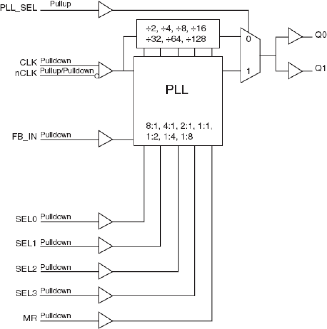 - Programmable dividers allow for the following output-to-input frequency ratios: 8:1, 4:1, 2:1, 1:1, 1:2, 1:4, 1:8