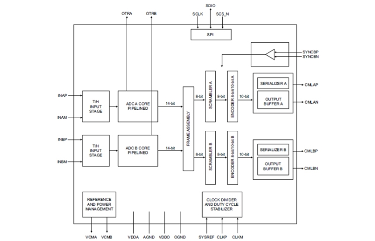 The ADC1453D250 is a dual channel 14-bit analog-to-digital converter (ADC) with JESD204B serial outputs interface optimized for high dynamic performance and low power consumption at sample rates up to 250Msps. Pipelined architecture and output error correction ensure the ADC1453D250 is accurate enough to guarantee zero missing codes over the entire operating range. Supplied from a single 1.8V source, the ADC1453D complies to the JESD204B serial output standard. An integrated serial peripheral interface (SPI) allows easy configuration of the ADC. With excellent dynamic performance from the baseband to input frequencies of 250MHz or more, the ADC1453D250 is ideal for use in undersampled multi-carrier, multi-standard communication system applications.