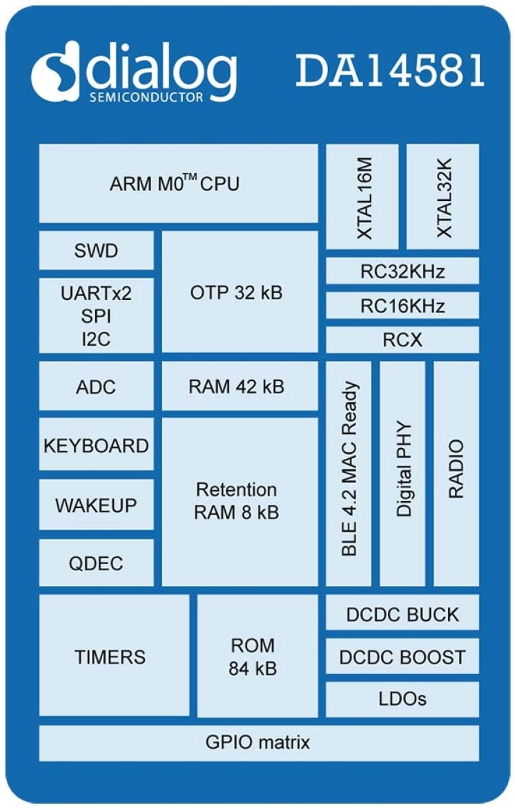 The DA14581 has dedicated hardware for the Link Layer implementation of Bluetooth Low Energy and interface controllers for enhanced connectivity capabilities.
