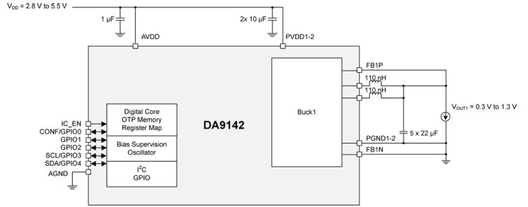 The device has an input voltage range of 2.8V to 5.5V and an output voltage range of 0.3V to 1.3V, making it suitable for a wide variety of low voltage systems. The DA9142 requires a minimum number of discrete components to operate, delivering a highly optimized BOM and footprint.