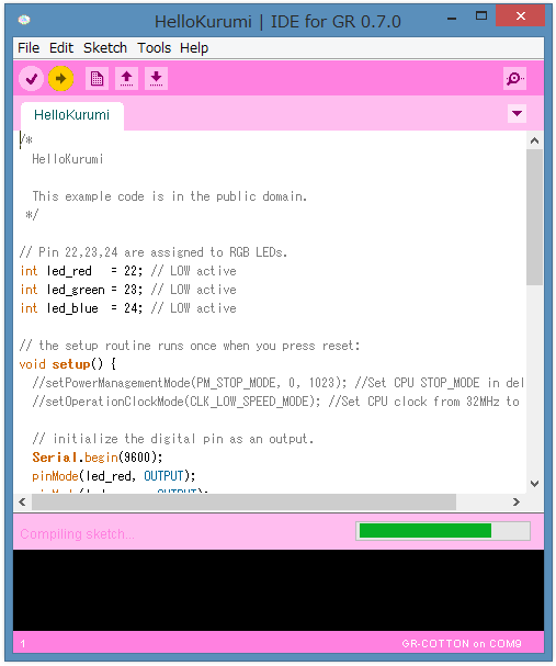 Once write is complete, the LED on GR-COTTON will light up. The serial monitor will display a “Hello” message.