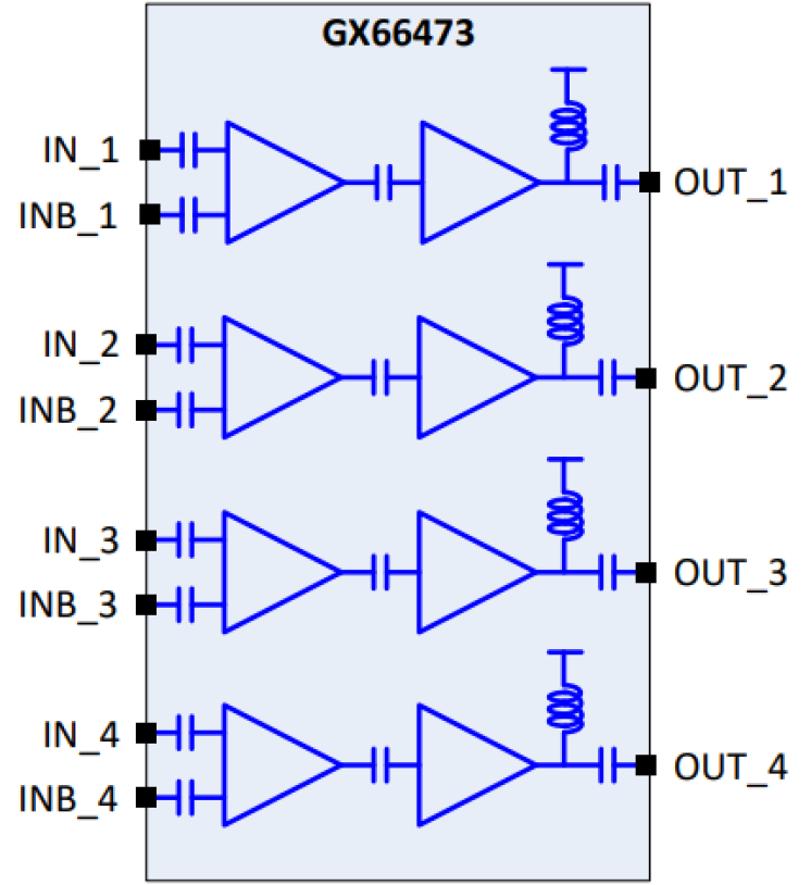 The GX66473 is a very low-power, high-performance, quad-channel linear driver, designed for 200G/400G optical transmitters for metro applications. The GX66473 is a small form factor (SFF) packaged surface mount device (SMD) with differential inputs and single-ended outputs consisting of 4 x 64Gbps broadband amplifier channels, each capable of driving a linear output voltage of 4.5Vpp, suitable for multi-level modulation applications.