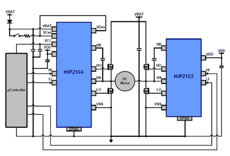 The HIP2103 and HIP2104 are half-bridge drivers designed for applications using DC motors, 3-phase brushless DC motors, or other similar loads. The two inputs (HI and LI) independently control the high-side driver (HO) and the low-side driver (LO). HI and LI can be configured to enable/disable the device, which lowers the number of connections to a microcontroller and the cost. The low IDD bias current in the Sleep Mode prevents battery drain when the device is not in use, which eliminates the need for an external switch to disconnect the driver from the battery. Integrated pull-down resistors on all of the inputs (LI, HI, VDen, and VCen) reduce the need for external resistors. An active low resistance pull-down on the LO output ensures that the low-side bridge FET remains off during the Sleep Mode or when VDD is below the Undervoltage Lockout (UVLO) threshold. The HIP2104 has a 12V linear regulator and a 3. 3V linear regulator with separate enable pins. The 12V regulator provides internal bias for VDD and the 3. 3V regulator provides bias for an external microcontroller (and/or other low voltage ICs), which eliminates the need for discrete LDOs or DC/DC converters.