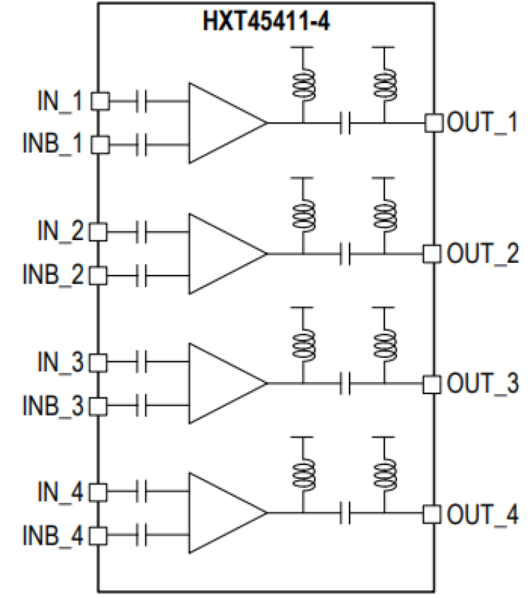 The HXT45411-4 is a low-power, high-performance, quad-channel linear driver, designed for 4 × 112Gb/s PAM4 EML–based transceivers. The HXT45411-4 is a small form-factor (SFF) packaged surface mount device (SMD) with differential inputs and single-ended outputs consisting of 4 × 56Gbaud broadband amplifier channels, each capable of driving a linear output voltage of 2.0VPP, suitable for 4λ 400G PAM-4 applications.