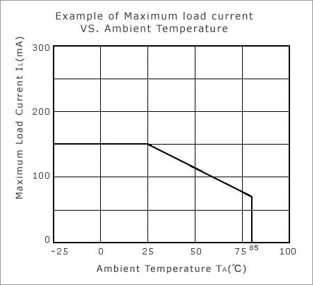 The allowable maximum value of the load current that can flow through the output MOSFET in the "ON" state. Whether DC or AC, keep the peak value (half of amplitude in the case of a sine wave) within this range. Because of the temperature dependency of allowable power dissipation, when the ambient temperature rises, this range declines as shown in the figure below.