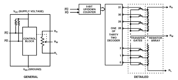 The Intersil ISL23511 is a three-terminal digitally-controlled potentiometer (XDCP) implemented by a resistor array composed of 31 resistive elements and a wiper switching network. The ISL23511 features a push button control, a shutdown mode, as well as an industry-leading µTQFN package. The push button control has individual PU and PD inputs for adjusting the wiper. To eliminate redundancy the wiper position will automatically increment or decrement if one of these inputs is held longer than one second. Forcing both PU and PD low for more than two seconds activates shutdown mode. Shutdown mode disconnects the top of the resistor chain and moves the wiper to the lowest position, minimizing power consumption. The three terminals accessing the resistor chain naturally configure the ISL23511 as a voltage divider. A rheostat is easily formed by floating an end terminal or connecting it to the wiper.