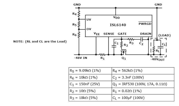 The ISL6140 is an 8 Ld, negative voltage hot plug controller that allows a board to be safely inserted and removed from a live backplane. Inrush current is limited to a programmable value by controlling the gate voltage of an external N-channel pass transistor. The pass transistor is turned off if the input voltage is less than the undervoltage threshold, or greater than the overvoltage threshold. A programmable electronic circuit breaker protects the system against shorts. The active low PWRGD signal can be used to directly enable a power module (with a low enable input). The ISL6150 is the same part, but with an active high PWRGD signal.