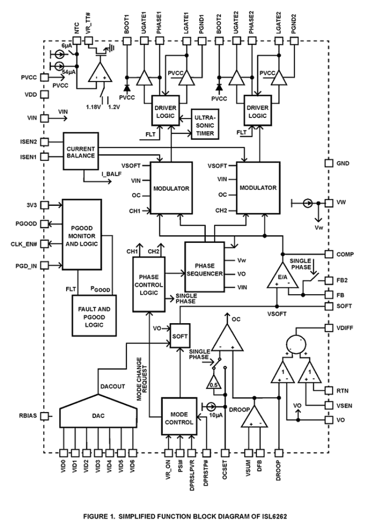 The ISL6262 is a two-phase buck converter regulator implementing Intel® IMVP-6 protocol, with embedded gate drivers. The two-phase buck converter uses two interleaved channels to effectively double the output voltage ripple frequency and thereby reduce output voltage ripple amplitude with fewer components, lower component cost, reduced power dissipation, and smaller real estate area. The heart of the ISL6262 is R3 Technology™, Intersil's Robust Ripple Regulator modulator. Compared with the traditional multiphase buck regulator, the R3 Technology™ has the fastest transient response. This is due to the R3 modulator commanding variable switching frequency during a load transient. Intel Mobile Voltage Positioning (IMVP) is a smart voltage regulation technology, which effectively reduces power dissipation in Intel Pentium processors. To boost battery life, the ISL6262 supports DPRSLRVR (deeper sleep), DPRSTP# and PSI# functions and maximizes the efficiency via automatically enabling different phase operation modes. At heavy load operation of the active mode, the regulator commands the two phase continuous conduction mode (CCM) operation. While the PSI# is asserted at the medium load in the active mode, the ISL6262 smoothly disables one phase and operates in a one-phase CCM. When the CPU enters deeper sleep mode, the ISL6262 enables diode emulation to maximize the efficiency at the light load. A 7-bit digital-to-analog converter (DAC) allows dynamic adjustment of the core output voltage from 0. 300V to 1. 500V. A 0. 5% system accuracy of the core output voltage over temperature is achieved by the ISL6262. A unity-gain differential amplifier is provided for remote CPU die sensing. This allows the voltage on the CPU die to be accurately measured and regulated per Intel IMVP-6 specifications. Current sensing can be realized using either lossless inductor DCR sensing or precision resistor sensing. A single NTC thermistor network thermally compensates the gain and the time constant of the DCR variations.