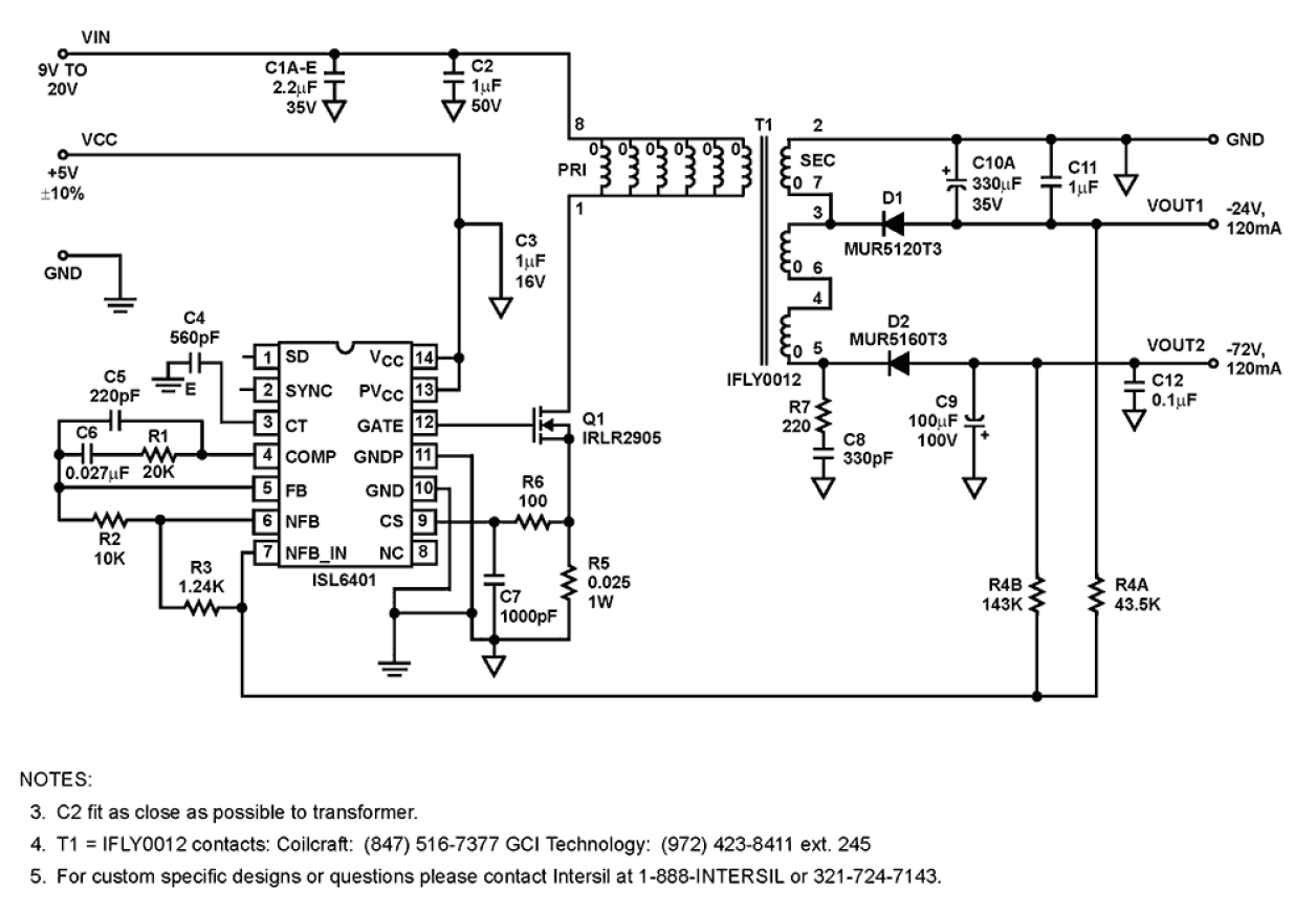 The ISL6401 adjustable frequency, low power, pulse width modulating (PWM) current mode controller is designed for a wide range of DC/DC conversion applications including boost, flyback, and isolated output configurations. The device is optimized to provide a high performance, low-cost solution for Ringing SLIC (RSLIC) ring and talk power supplies. An integrated inverter allows for easy design of negative voltage regulation circuits with a minimal amount of external components. Internal soft start minimizes start-up stress without any external components. Peak current mode control effectively handles Ring trip transients and provides inherent over-current protection. This advanced BiCMOS design features low operating current, adjustable operating output frequency (50kHz to 600kHz), internal soft-start and a SYNC input that allows the oscillator to be locked to an external clock for noise sensitive applications. DC/DC conversion efficiency is optimized by use of a low current sense voltage. A logic level shutdown input is included, which reduces supply current to 55µA in the shutdown mode.