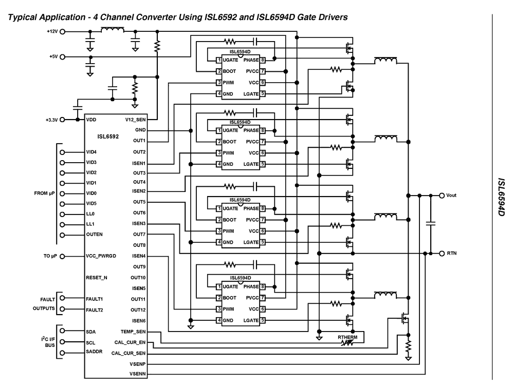 The ISL6594D is high frequency MOSFET driver specifically designed to drive upper and lower power N-Channel MOSFETs in a synchronous rectified buck converter topology. This driver combined with the ISL6594D Digital Multi-Phase Buck PWM controller and N-Channel MOSFETs forms a complete core-voltage regulator solution for advanced microprocessors. The ISL6594D drives both upper and lower gates over a range of 4. 5V to 13. 2V. This drive-voltage provides the flexibility necessary to optimize applications involving trade-offs between gate charge and conduction losses. An advanced adaptive zero shoot-through protection is integrated to prevent both the upper and lower MOSFETs from conducting simultaneously and to minimize the dead time. The ISL6594D includes an overvoltage protection feature operational before VCC exceeds its turn-on threshold, at which the PHASE node is connected to the gate of the low side MOSFET (LGATE). The output voltage of the converter is then limited by the threshold of the low side MOSFET, which provides some protection to the microprocessor if the upper MOSFET(s) is shorted. The ISL6594D also features an input that recognizes a high-impedance state, working together with Intersil multiphase PWM controllers to prevent negative transients on the controlled output voltage when operation is suspended. This feature eliminates the need for the Schottky diode that may be utilized in a power system to protect the load from negative output voltage damage.