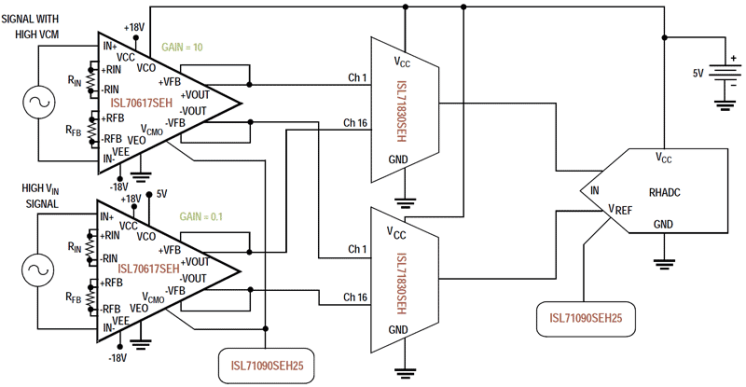 The ISL70617SEH is a high performance, differential input, differential output instrumentation amplifier designed for precision analog-to-digital applications. It can operate over a supply range of 8V (±4V) to 36V (±18V) and features a differential input voltage range up to ±30V. The output stage has rail-to-rail output drive capability optimized for differential ADC driver applications. The output stage is powered by separate supplies. This feature enables the output to be driven by the same low voltage supplies powering the ADC, thereby providing protection from high voltage signals and the low voltage digital circuits. Its versatility makes it suitable for a variety of general purpose applications. Additional features not found in other instrumentation amplifiers enable high levels of DC precision and excellent AC performance. The gain of the ISL70617SEH can be programmed from 0. 1 to 10, 000 via two external resistors, RIN and RFB. The gain accuracy is determined by the matching of RIN and RFB. The gain resistors have Kelvin sensing, which removes gain error due to PC trace resistance. The input and output stages have individual power supply pins, which enable input signals riding on a high common-mode voltage to be level shifted to a low voltage device, such as an A/D converter. The rail-to-rail output stage can be powered from the same supplies as the ADC, which preserves the ADC maximum input dynamic range and eliminates ADC input overdrive. The ISL70617SEH is offered in a 24 Ld ceramic flatpack package with an operating temperature range of -55°C to +125°C.