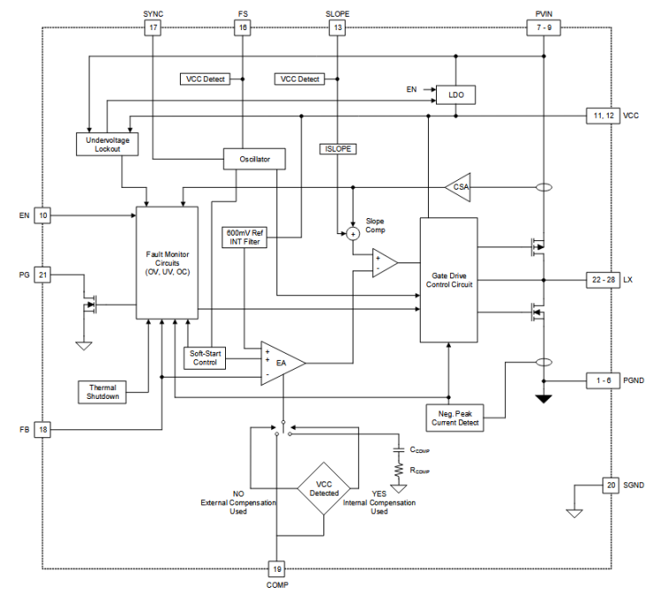 - Adjustable switching frequency: 300kHz to 1MHz or fixed 500kHz