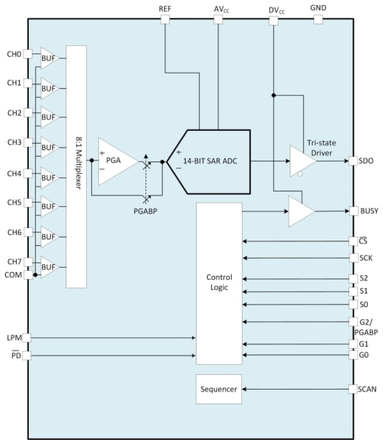 - 900kSPS throughput rate with PGA bypass 480ksps with the PGA enable all with no data latency