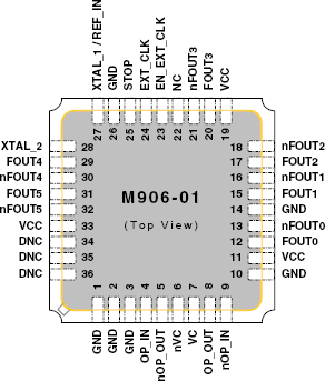 The M906-01 is a PLL (Phase Locked Loop) based clock generator that uses an internal VCSO (Voltage Controlled SAW Oscillator) to produce a very low jitter output clock. It is ideal for Gigabit Ethernet. The output clock (frequency of 156.25 or 187.50MHz for example) is provided from six LVPECL clock output pairs. (Specify frequency at time of order.) The accuracy of the output frequency is assured by the internal PLL, which phase-locks the internal VCSO to the reference input frequency (25 or 30MHz for example). The input reference can either be an external crystal, utilizing the internal crystal oscillator, or a stable external clock source such as a packaged crystal oscillator.