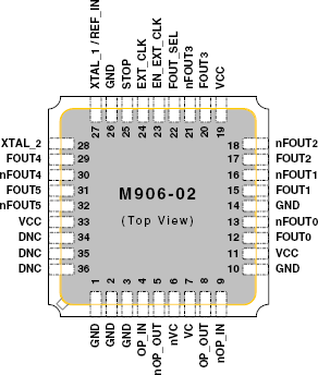The M906-02 is a Phase-Locked Loop (PLL) based clock generator that uses an internal Voltage Controlled SAW Oscillator (VCSO) to produce a very low jitter output clock. From the M906-02-155.5200, an output clock frequency of 155.52 or 77.76MHz is provided from six LVPECL clock output pairs. (Other frequencies are available; consult the factory.) The accuracy of the output frequency is assured by the internal PLL that phase-locks the internal VCSO to the reference input frequency (19.44MHz for the M906-02-155.5200). The input reference can either be an external crystal, utilizing the internal crystal oscillator, or a stable external clock source such as a packaged crystal oscillator.