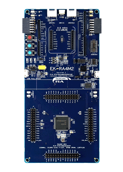 Kickstart IoT and embedded systems development using Renesas EK-RA4M2 and EK-RA4M3, Evaluation Kits for RA4M2 and RA4M3 MCU Groups. Familiarize yourself with the kit architecture, key features, quick start example project, and many useful resources to begin innovating quickly.