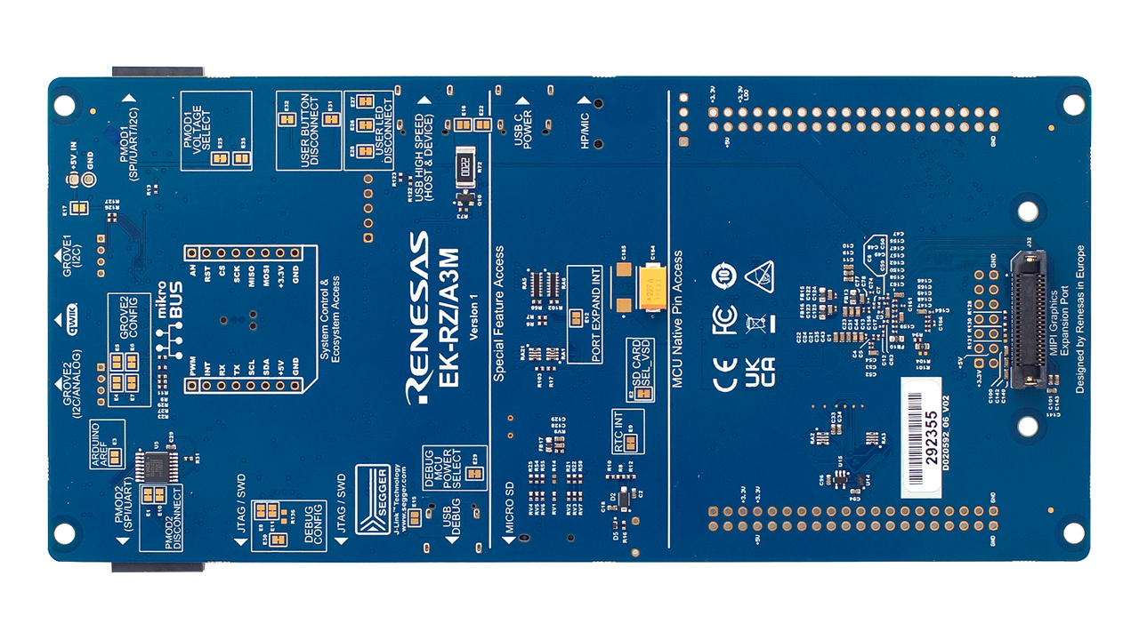 The EK-RZ/A3M evaluation kit enables users to easily evaluate the features of the RZ/A3M MPU. This kit includes an EK-RZ/A3M board, 5-inch 720x1280 pixel LCD MIPI graphics expansion board, and USB cables, allowing the seamless evaluation of high-definition human machine interface (HMI), camera input through USB, and more features. Equipped with an on-board J-Link debugger, users can conveniently start debugging without additional debuggers. Additionally, it also has several expansion connectors such as SDIO, PMOD, and Arduino to connect sensors, Wi-Fi, and Bluetooth® Low Energy (LE), allowing users to add more features without expanding the board space.