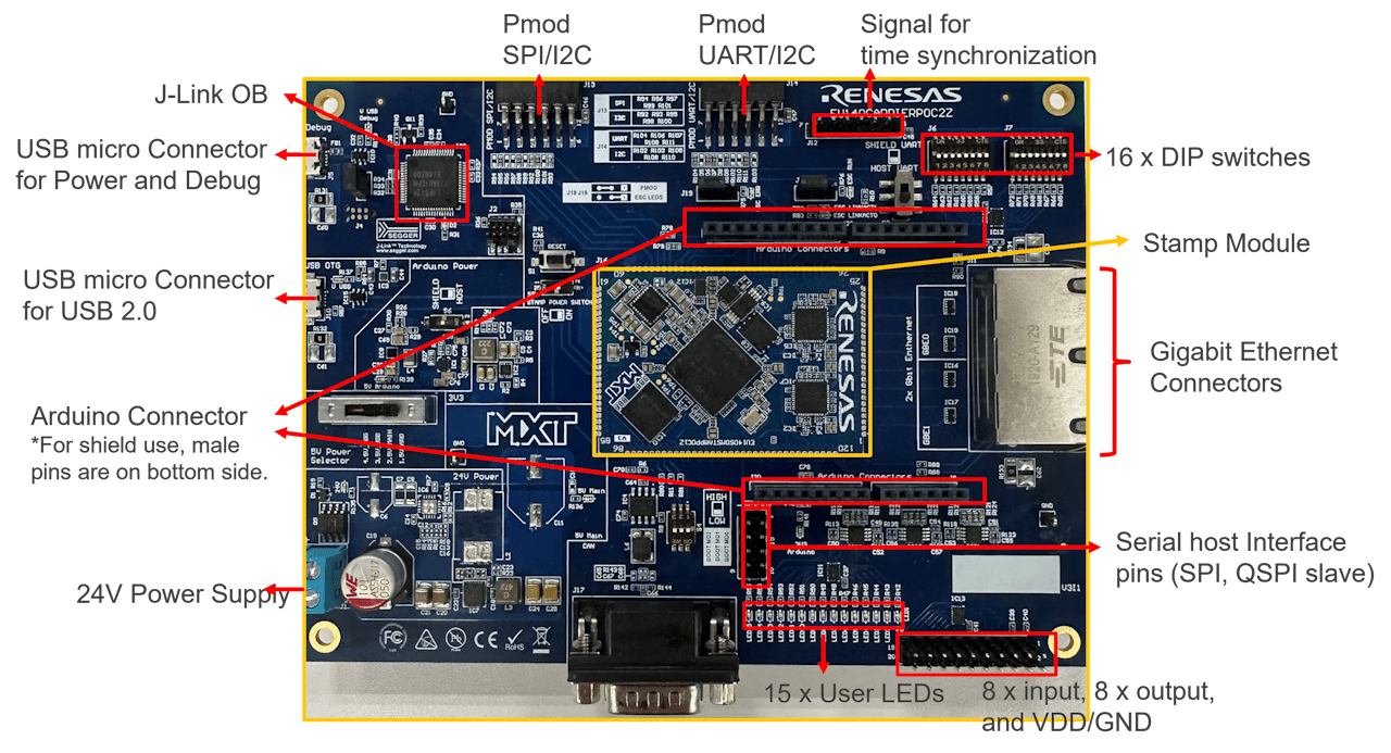 The kit provides EtherCAT, EtherNet/IP and Modbus sample software. With the Gigabit PHYs, it is well prepared to support real-time Ethernet communication based on TSN.