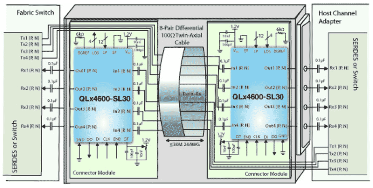 The QLx4600-SL30 is a settable quad receive-side equalizer with extended functionality for advanced protocols operating with line rates up to 6. 25Gb/s such as 4k video capable DisplayPort v1. 2 (HBR1/2), InfiniBand (SDR and DDR) and 10GBase-CX4. The QLx4600-SL30 compensates for the frequency dependent attenuation of copper twin-axial cables, extending the signal reach up to 30m on 24AWG cable. The small form factor, highly-integrated quad design is ideal for high-density data transmission applications including active copper cable assemblies. The four equalizing filters within the QLx4600-SL30 can each be set to one of 32 compensation levels, providing optimal signal fidelity for a given media and length. The compensation level for each filter can be set by either (a) three external control pins or (b) a serial bus interface. When the external control pins are used, 18 of the 32 boost levels are available for each channel. If the serial bus is used, all 32 compensation levels are available. Operating on a single 1. 2V power supply, the QLx4600-SL30 enables per channel throughputs of up to 6. 25Gb/s while supporting lower data rates including 5, 4. 25, 3. 125 and 2. 5Gb/s. The QLx4600-SL30 uses Current Mode Logic (CML) inputs/outputs and is packaged in a 4mmx7mm 46 Ld QFN. Individual lane LOS support is included for module applications.
