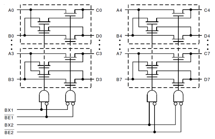 - 5 ohm switches connect inputs to outputs