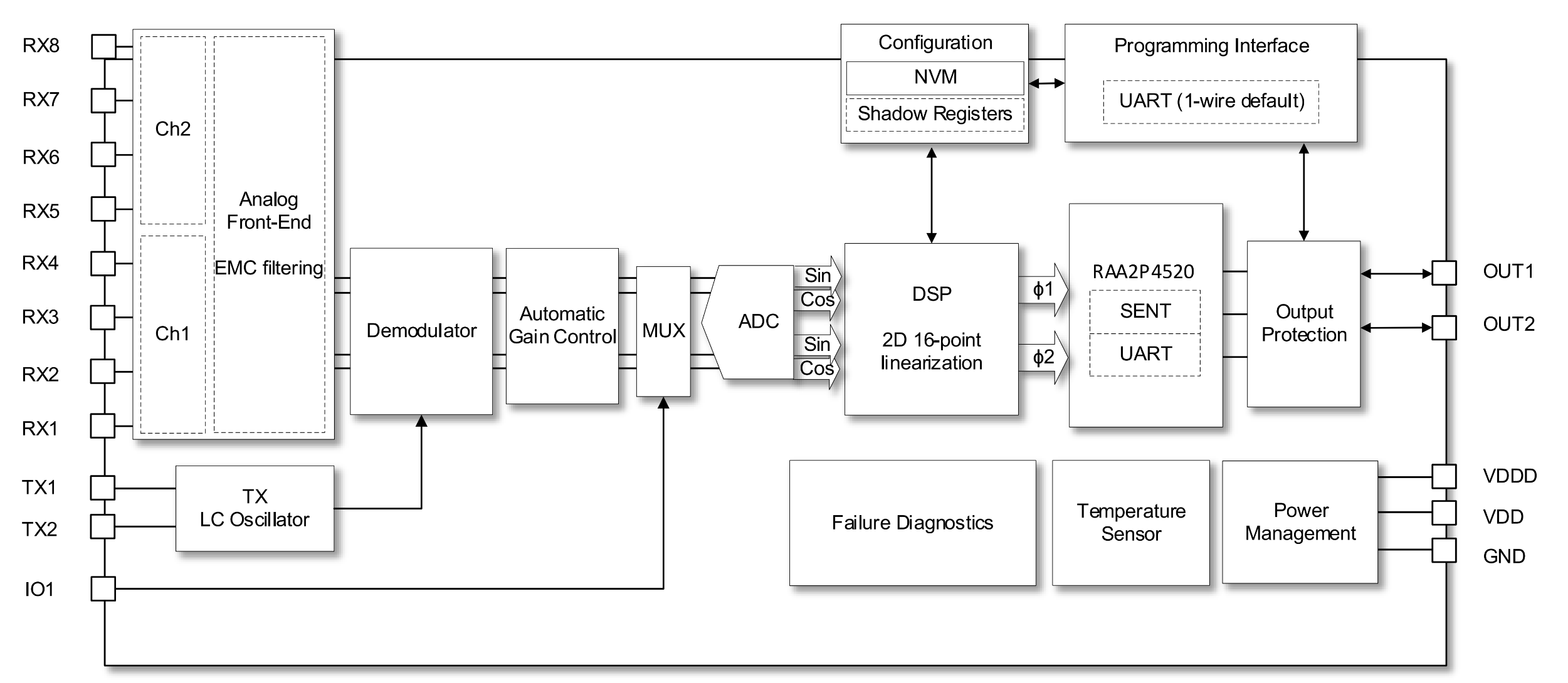 - Output interfaces: high-speed UART up to 2Mbit/s, SENT 14-bit