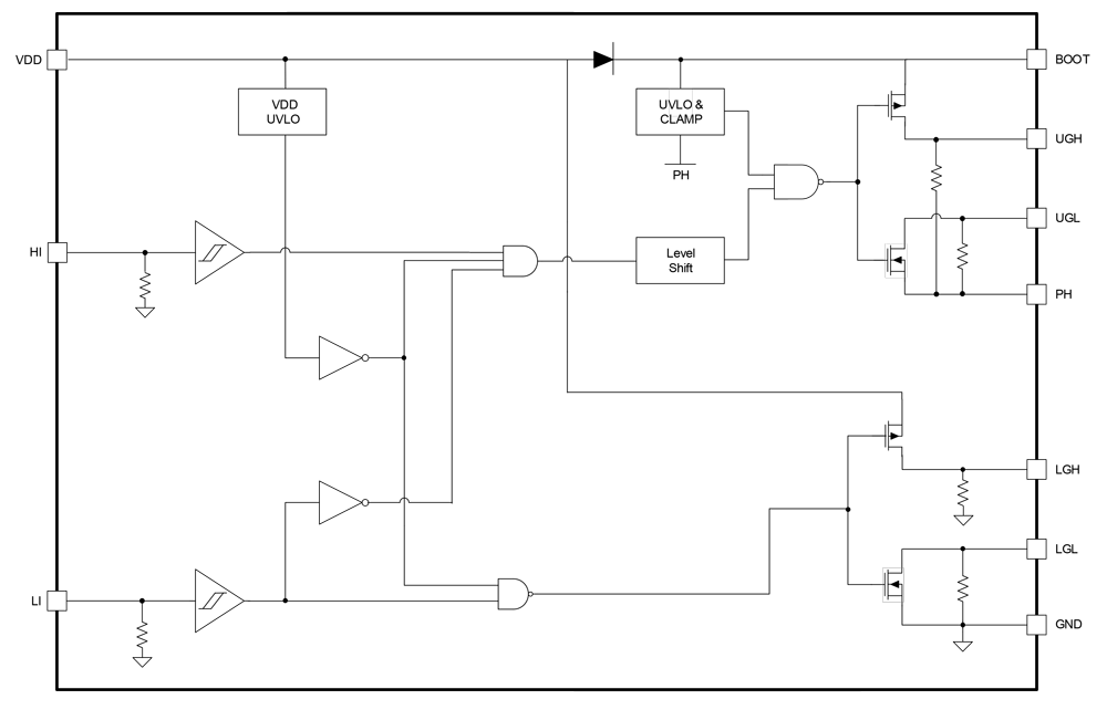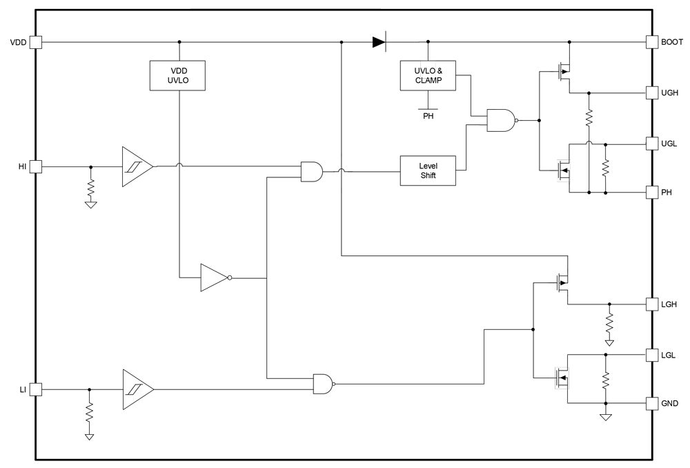 The RRP68151 is a 5V‑powered, high‑frequency half‑bridge driver optimized for enhancement‑mode GaN FETs and low‑threshold N‑channel MOSFETs. It delivers 2A source and 5.3A sink current capability, supporting a switching node up to 100V DC. The driver’s PWM inputs are compatible with 3.3V/5V CMOS logic and can tolerate up to 14V, independent of the VDD supply. The high‑side bias voltage uses a bootstrap technique and is internally clamped at 5.4V to prevent exceeding the GaN FET’s maximum gate‑source rating. A 5V operational supply simplifies power sharing with the controller.