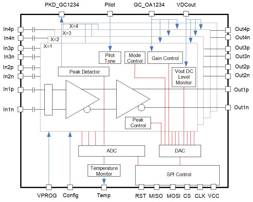 The device integrates analog control circuitry and digital control via an serial peripheral interface (SPI), enabling precise, independent drive‑level control, and monitoring. Each driver channel features a 100 Ω differential AC‑coupled input and a 60 Ω differential interface with an open‑collector output stage. The device is suitable for InP based, thin‑film lithium niobate, and silicon photonics Mach–Zehnder modulators.