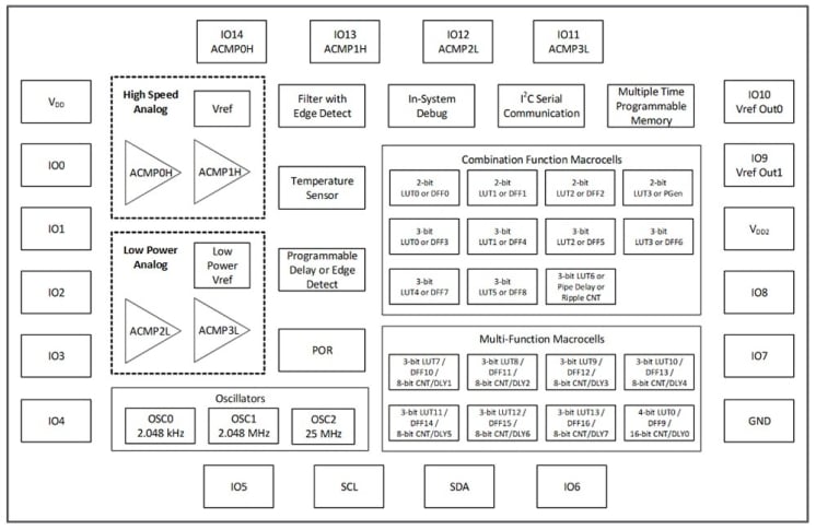 The SLG46826-E programmable mixed-signal matrix IC with extended temperature range provides a small, low-power component for commonly used mixed-signal functions. The user creates their circuit design by programming the multiple-time programmable non-volatile memory (NVM) to configure the interconnect logic, the IO pins, and the macrocells of the SLG46826-E. A dual power supply allows the device to flexibly interface two independent voltage domains. This highly versatile device allows for a wide variety of mixed-signal functions to be designed within a very small, low-power single integrated circuit.