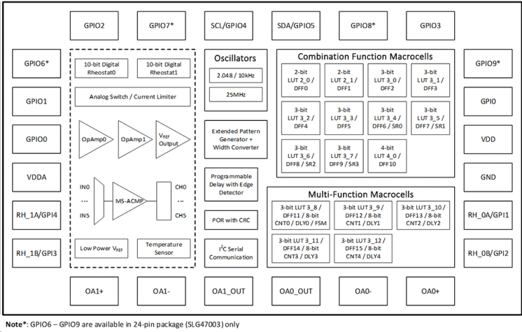 The SLG47003 provides a small, low-power component for commonly used analog signal processing and mixed-signal functions. Individual tunable analog components used in conjunction with configurable logic provide a way to solve a wide variety of tasks with minimal costs. The user creates their circuit design by programming the one-time programmable (OTP) non-volatile memory (NVM) to configure the interconnect logic, the macrocells, and the IO pins of the SLG47003.