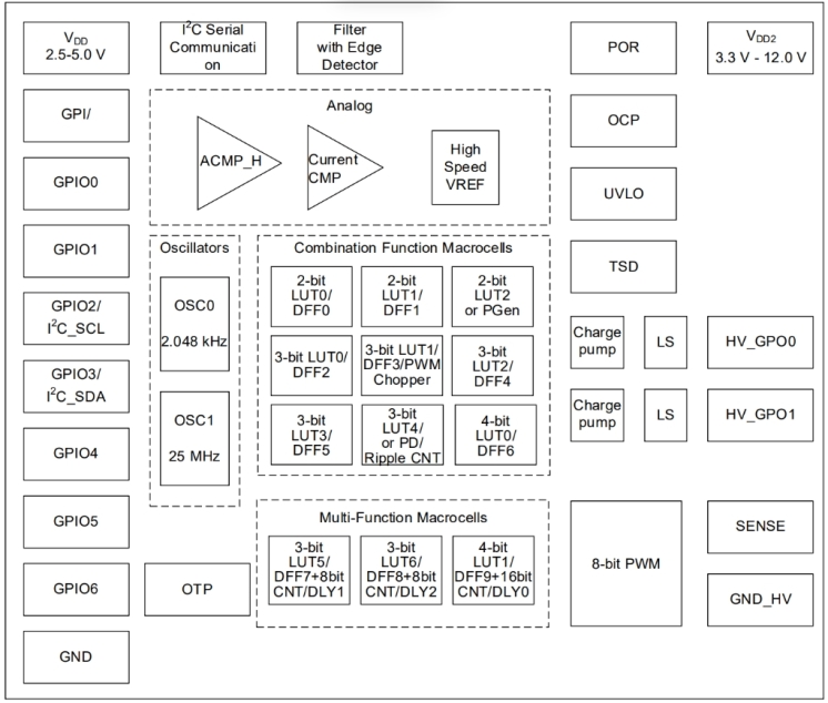 - 1× Selectable DFF/LATCH or 3-bit LUT or PWM Chopper