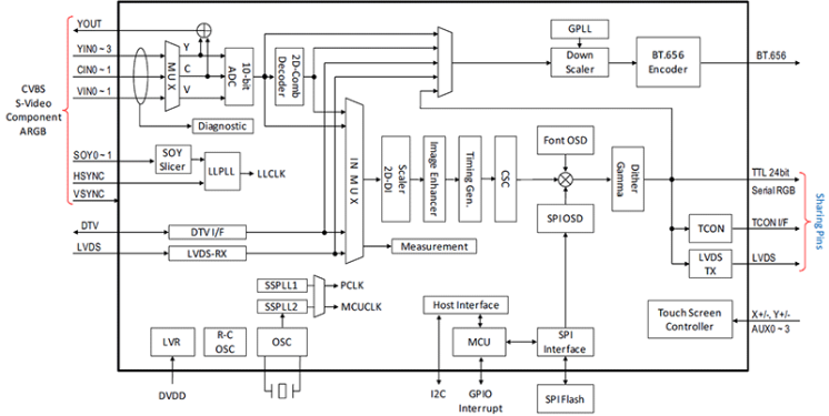 The TW8836 is a highly integrated LCD video processor that incorporates many of the features required to create a multipurpose LCD display system into a single package. This includes a high quality, 2D comb NTSC/PAL/SECAM video decoder, triple high-speed RGB ADCs, an LVDS and TTL digital input interface, a high-quality scaler and deinterlacer, and a versatile OSD, with a high-performance output panel interface for MCU and LVDS or TTL.
