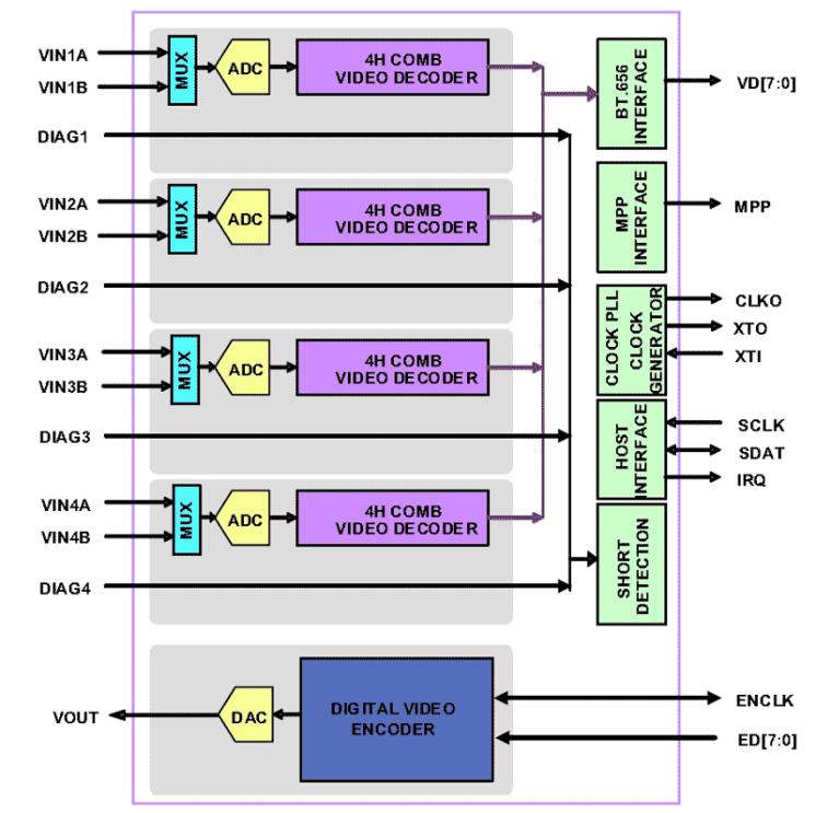 The TW9984 includes four high quality NTSC/PAL/SECAM video decoders that convert analog composite video signal to digital component YCbCr data. Each channel contains a 10-bit ADC with application selectable differential or single-ended analog video input options, proprietary clamp and gain controllers and utilizes 4H comb filter for separating luminance and chrominance to reduce cross noise artifacts. The TW9984 adopts the image enhancement techniques, such as IF compensation filter, CTI and programmable peaking. TW9984 also includes an NTSC/PAL video encoder with a 10-bit DAC to support CVBS output.