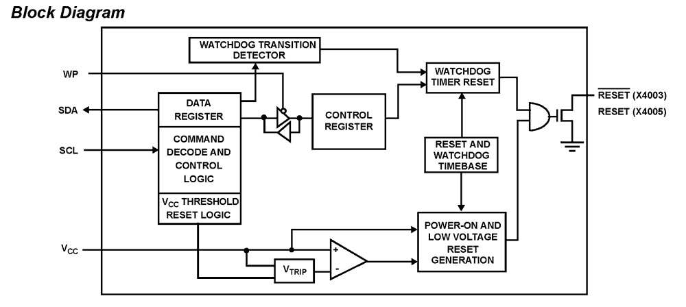 These devices combine three popular functions, Power-on Reset Control, Watchdog Timer, and Supply Voltage Supervision. This combination lowers system cost, reduces board space requirements, and increases reliability. Applying power to the device activates the power-on reset circuit which holds RESET/RESET active for a period of time. This allows the power supply and oscillator to stabilize before the processor can execute code. The Watchdog Timer provides an independent protection mechanism for microcontrollers. When the microcontroller fails to restart a timer within a selectable time out interval, the device activates the RESET/RESET signal. The user selects the interval from three preset values. Once selected, the interval does not change, even after cycling the power. The Device's low VCC detection circuitry protects the user's system from low voltage conditions, resetting the system when VCC falls below the minimum VCC trip point. RESET/RESET is asserted until VCC returns to proper operating level and stabilizes. Five industry standard VTRIP thresholds are available; however, Intersil's unique circuits allow the threshold to be reprogrammed to meet custom requirements, or to fine-tune the threshold for applications requiring higher precision.