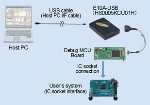 "Debug MCU board" is an optional board to use the E10A-USB on-chip debugging emulator in development of systems using pins for user-debugging interface (H-UDI) and alternative ones. Users can use all pins of the MCU (the emulator does not occupy any pins of the MCU).