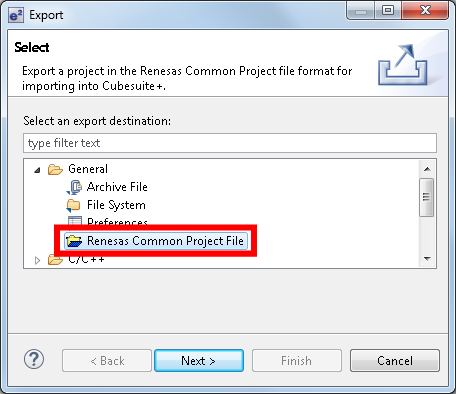 - Select [Renesas Common Project File] as the destination for export and output the project file.