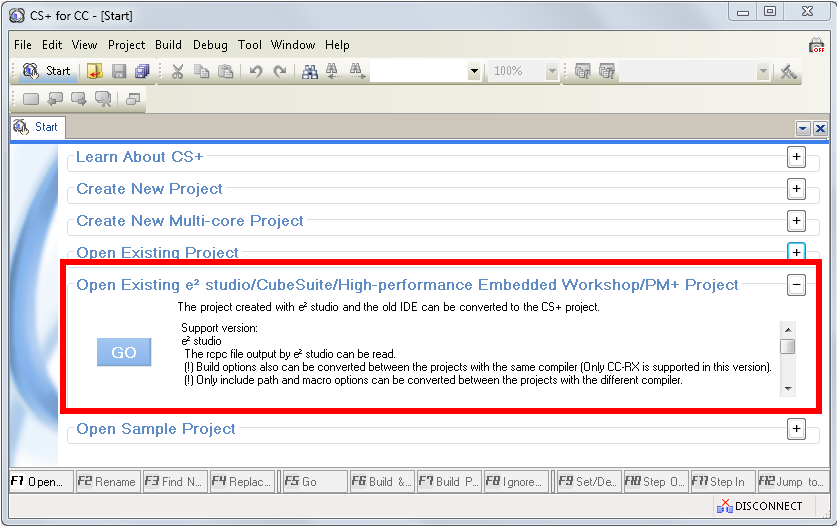 - Specify the exported project file (*.rcpc) from the project that is to be converted for CS+. Select [Open Existing e² studio/CubeSuite/High-performance Embedded Workshop/PM+ Project] in the startup screen of CS+.