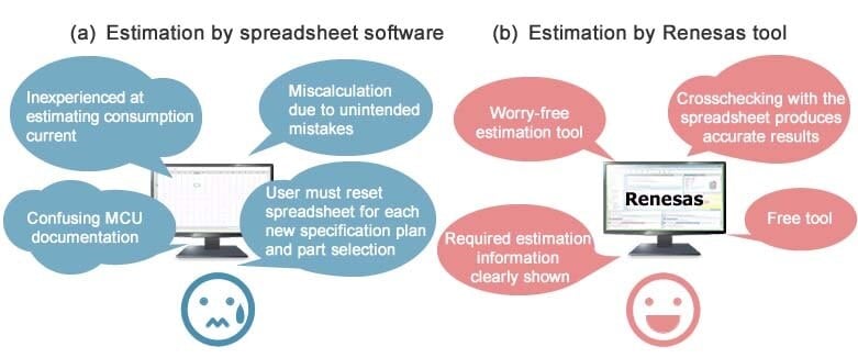 In order to solve this type of problem, Renesas Electronics investigated the MCU current measurement method to imitate actual testing. Therefore the current estimation tool better facilitates the initial stage of development, such as specification planning.